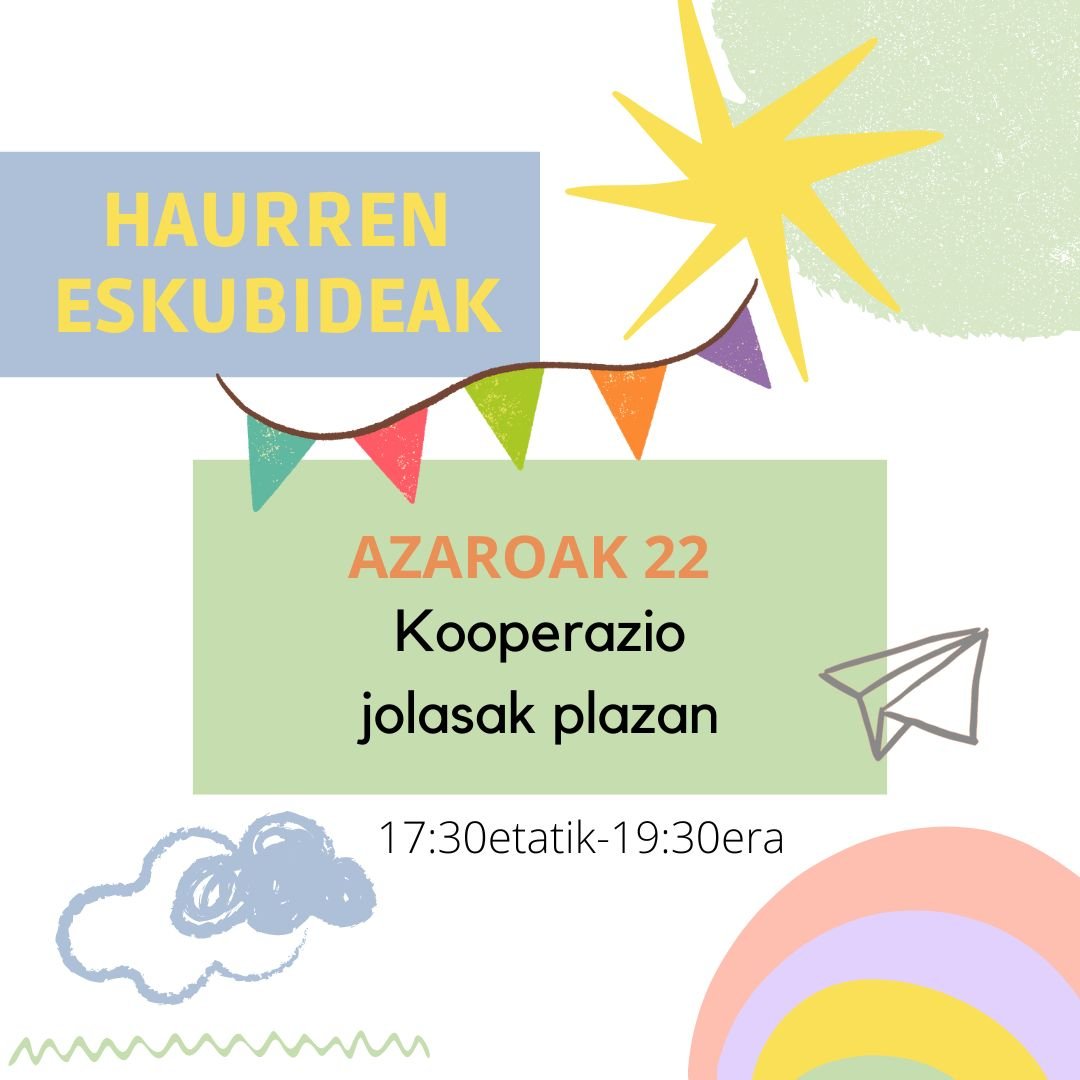 Azaroak 22 Asteartea 17:30 Azaroaren 22an, haurren nazioarteko eguna ospatzen da eta horren inguruan herriko haurrekin jolas kooperatiboak egingo dira plazan. Ekitaldi mota Bestelakoa