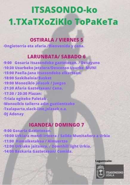 Maiatzak 6 Larunbata 10:00 Asteburuan zehar monoziklo topaketa egingo dute herrian. Gaztelekuan hartuko dute ostatu dozena bat lagunek eta herrian zehar ikusteko aukera izango ditugu. Kartelean duzue egitarau osoa. Ekitaldi mota Bestelakoa