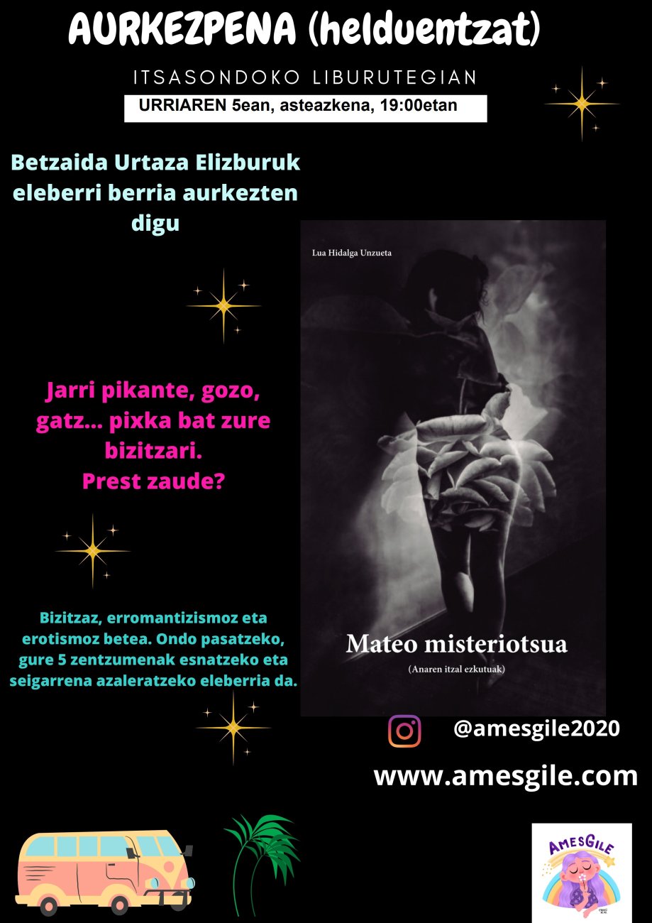 Urriak 5 Osteguna 19:00 Betzaida Urtazaren nobela erotikoaren aurkezpena izango dugu udal liburutegian. Ekitaldi mota Bestelakoa