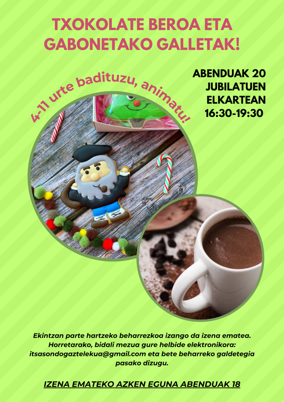 Badatoz gabonak eta horiekin batera, gabonetako ekintza bereziak! Abenduren 20ean, ostirala, 16:30ean hasita txokolate beroa eta gailetak egingo ditugu. Horretarako izen ematea egitea eskatzen dizuegu, osagaiak erosteko zenbat izango garen jakiteko: